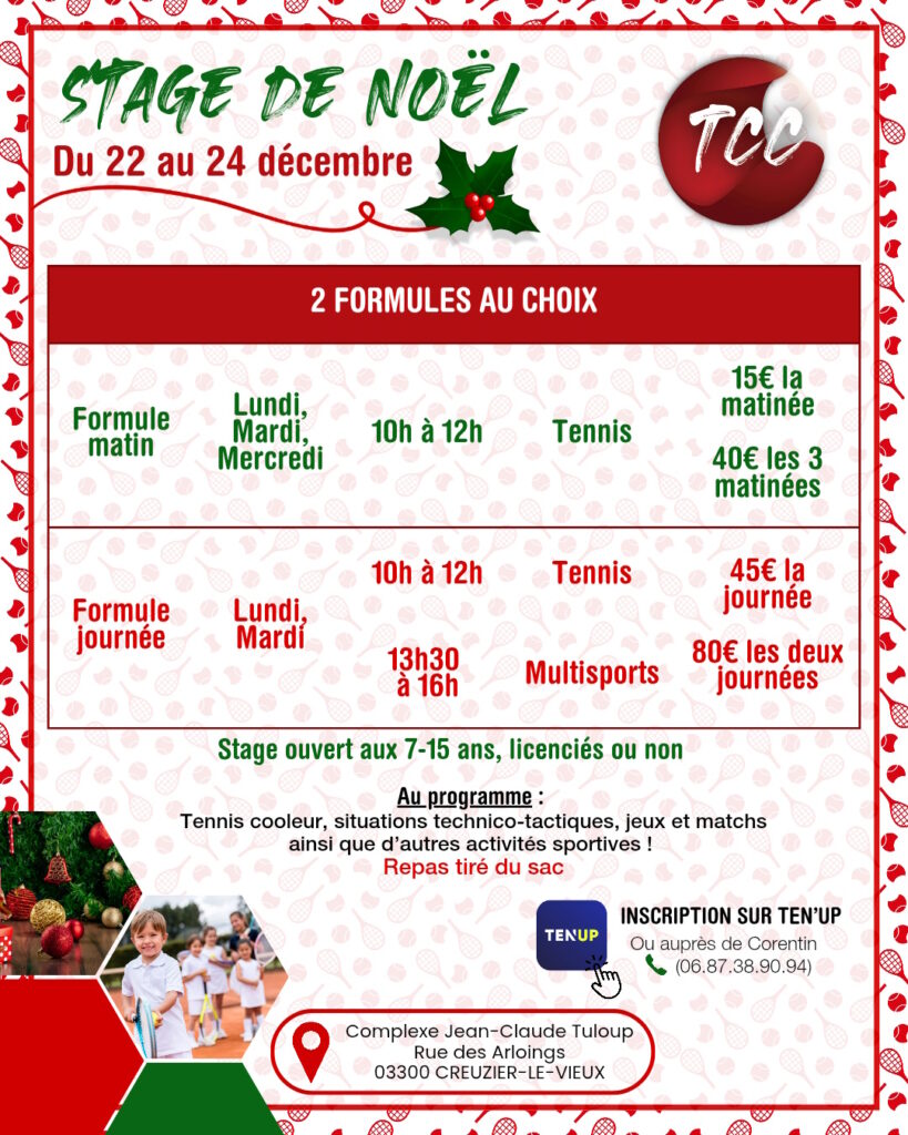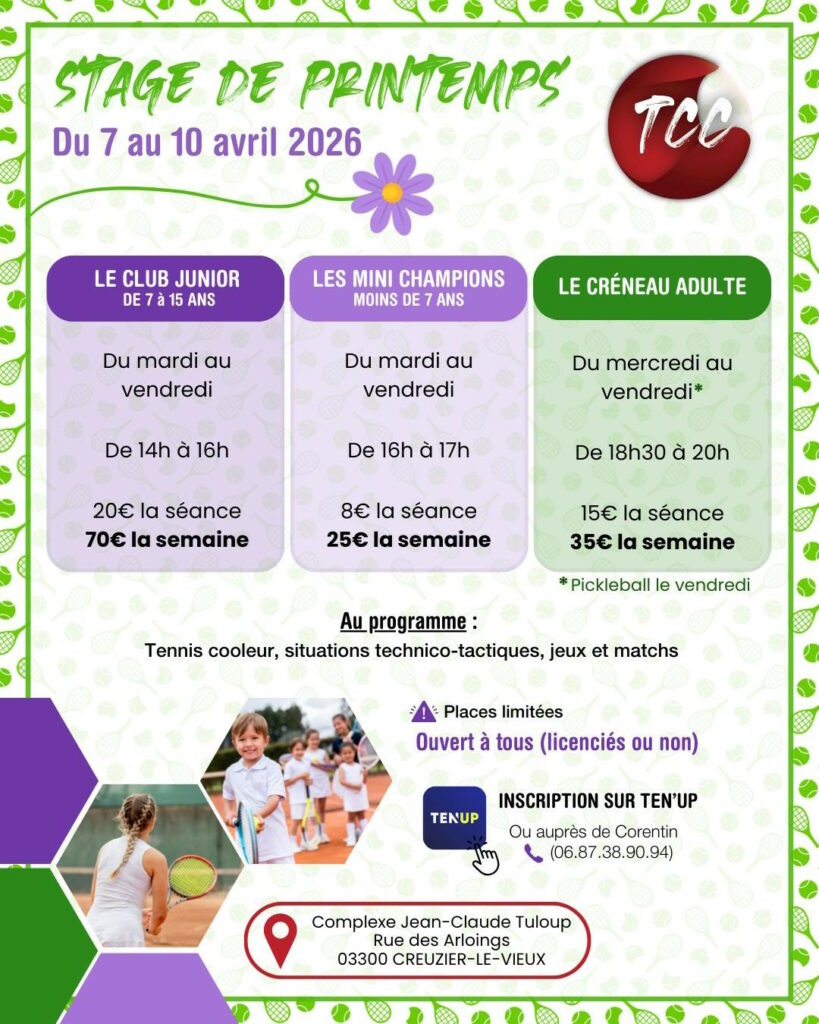 Tous les stages organisés par le Tennis Club Creuziérois sont encadrés par un enseignant professionnel diplômé et qualifié.